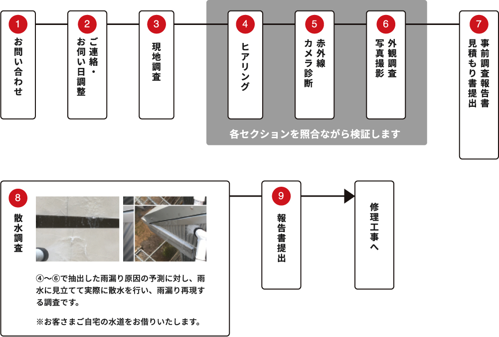 雨漏りが居住者さまが自覚できる形になって現れてくるまでには、雨水が侵入して到達するまでの経路を辿ってくる時間が必要です。ですので多くの場合、自覚したときから遡って4〜5年も前から雨水が侵入している場合があります。雨漏りには必ず、雨水が侵入する場所があり、現出するまでの経路があります。雨漏りを解消するには、この一連の流れを解明する必要があるのです。